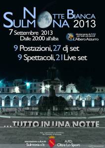 Tutto pronto per la nuova edizione della Notte Bianca. Domani sera a partire dalle ore 20 tutto il centro di Sulmona sarà animato da proposte musicali ed artistiche di vario genere, per accontentare chiunque abbia voglia di vivere in pieno le bellezze della città, che rappresenta un polo culturale importante per tutta la provincia dell’Aquila. La manifestazione, tutta ad ingresso gratuito, è promossa dall’Associazione culturale “Sulmona c’è” e dall’associazione “Oltre lo sport”, con il patrocinio e il contributo del Comune di Sulmona.
