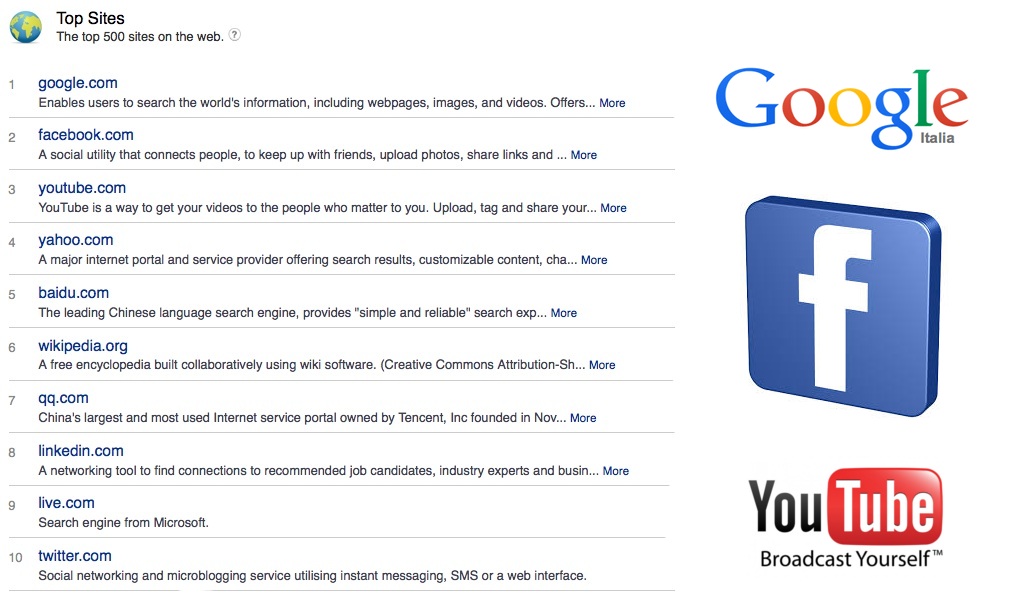 Le cose cambiano sensibilmente se la tabella dei primi 100 siti viene rapportata al nostro Paese. Nella classifica TOP 100 ITALIA le prime dieci posizioni sono occupate da: