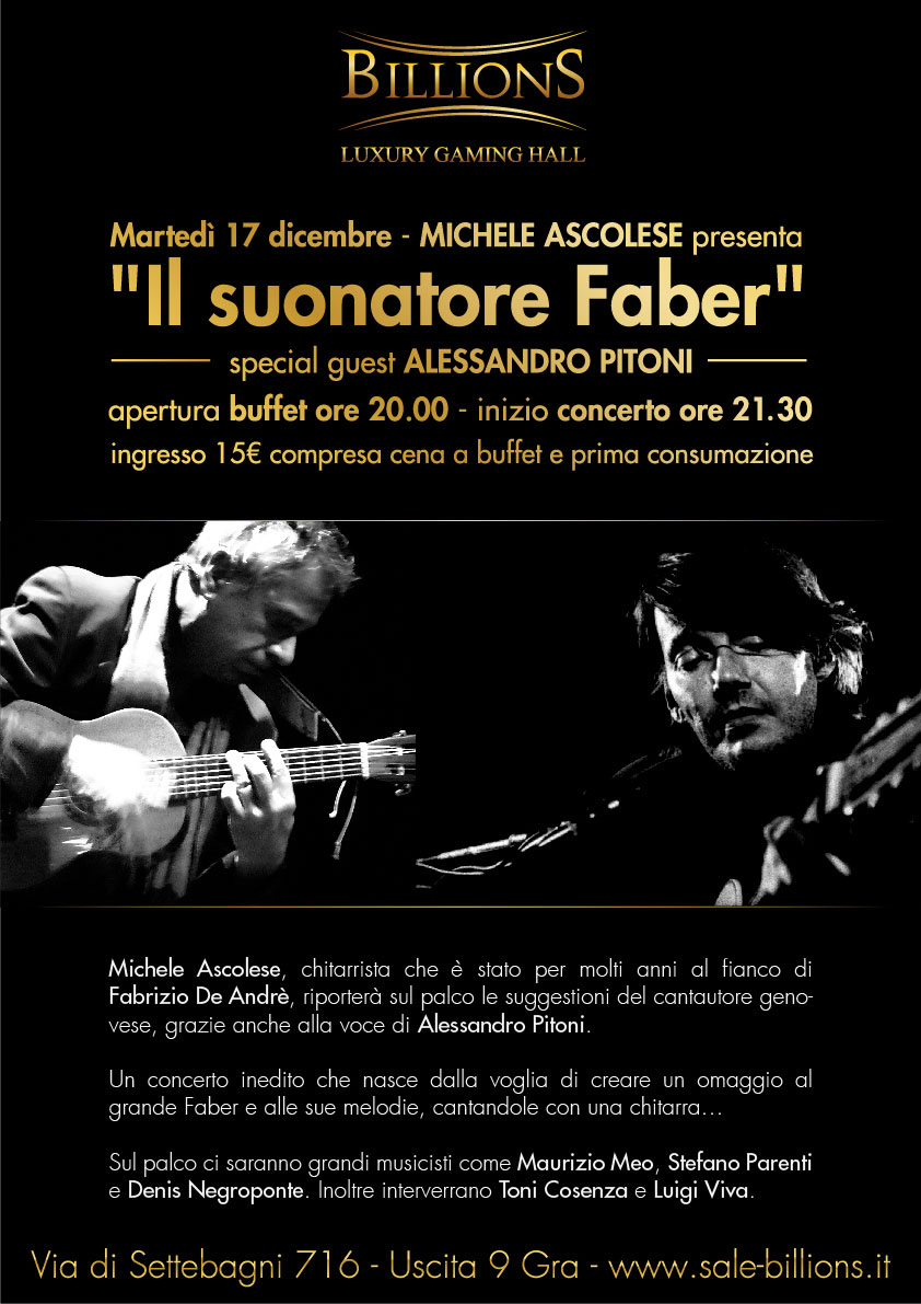 il-suonatore-faberMartedì 17 dicembre alle ore 21:30, MICHELE ASCOLESE presenta “Il suonatore Faber” special guest ALESSANDRO PITONI. Una notte dedicata a Fabrizio De Andrè, sulle note del chitarrista che l’ha accompagnato per gran parte della sua carriera. Michele Ascolese, virtuoso delle sei corde e artista stimato a livello internazionale, riporterà sul palco le suggestioni del cantautore genovese grazie anche alla voce di Alessandro Pitoni, che si unirà al progetto appositamente per questa data speciale.