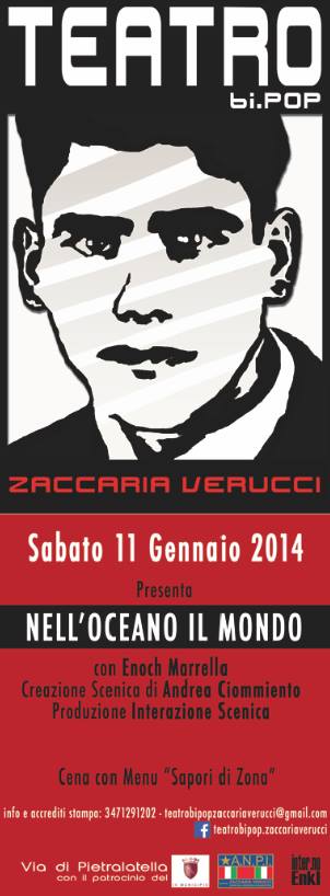 Sabato 11 gennaio 2014 alle ore 21:30, a seguire un apericena in piena regola dal titolo “Sapori di Zona”, va in scena al Teatro Bi.Pop. “Zaccaria Verucci” – presso Zona Rischio di Via di Pietralatella, s.n.c., Casal Bertone – lo spettacolo NELL’OCEANO IL MONDO con Enoch Marrella. Creazione Scenica di Andrea Ciommiento