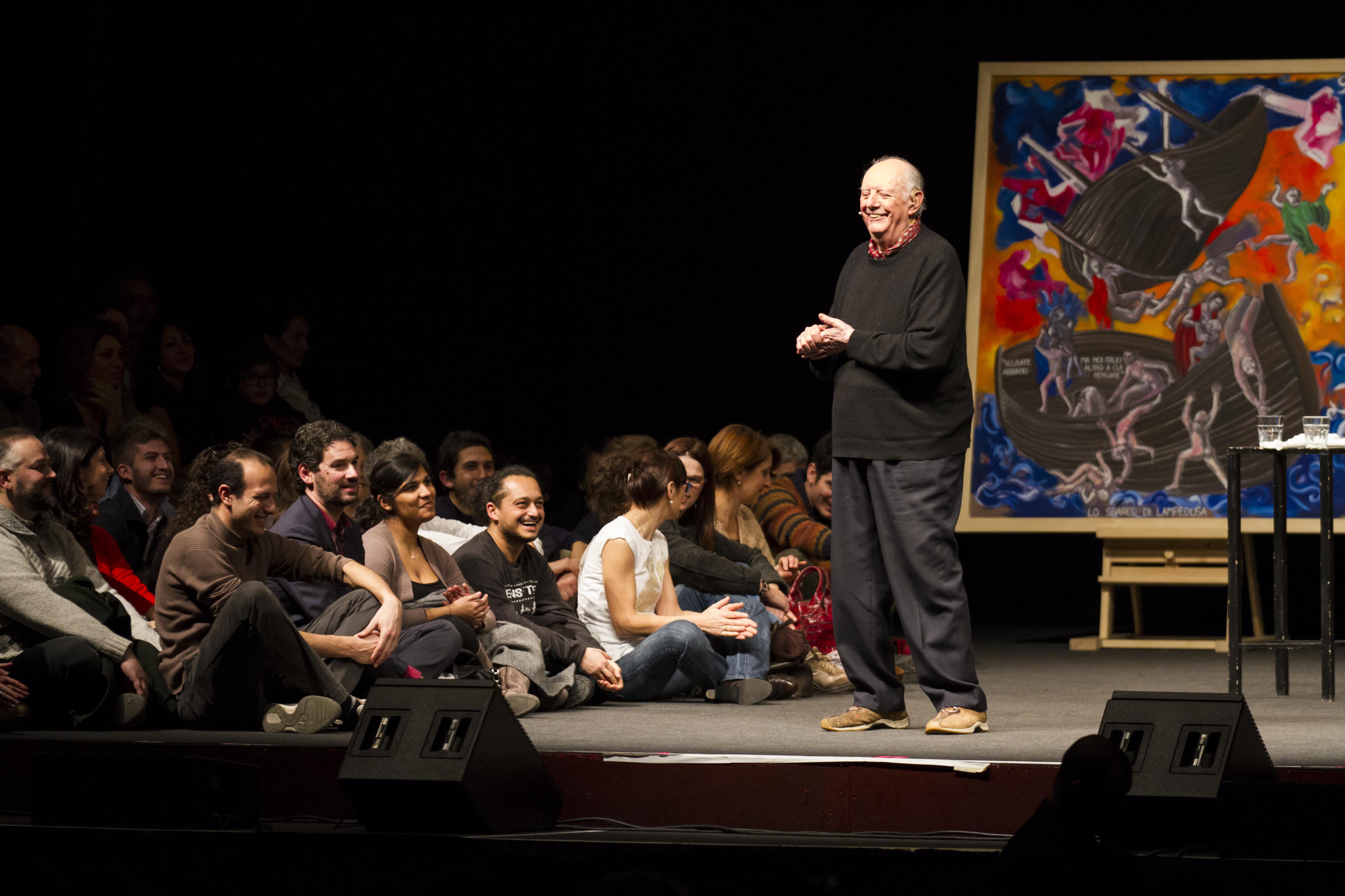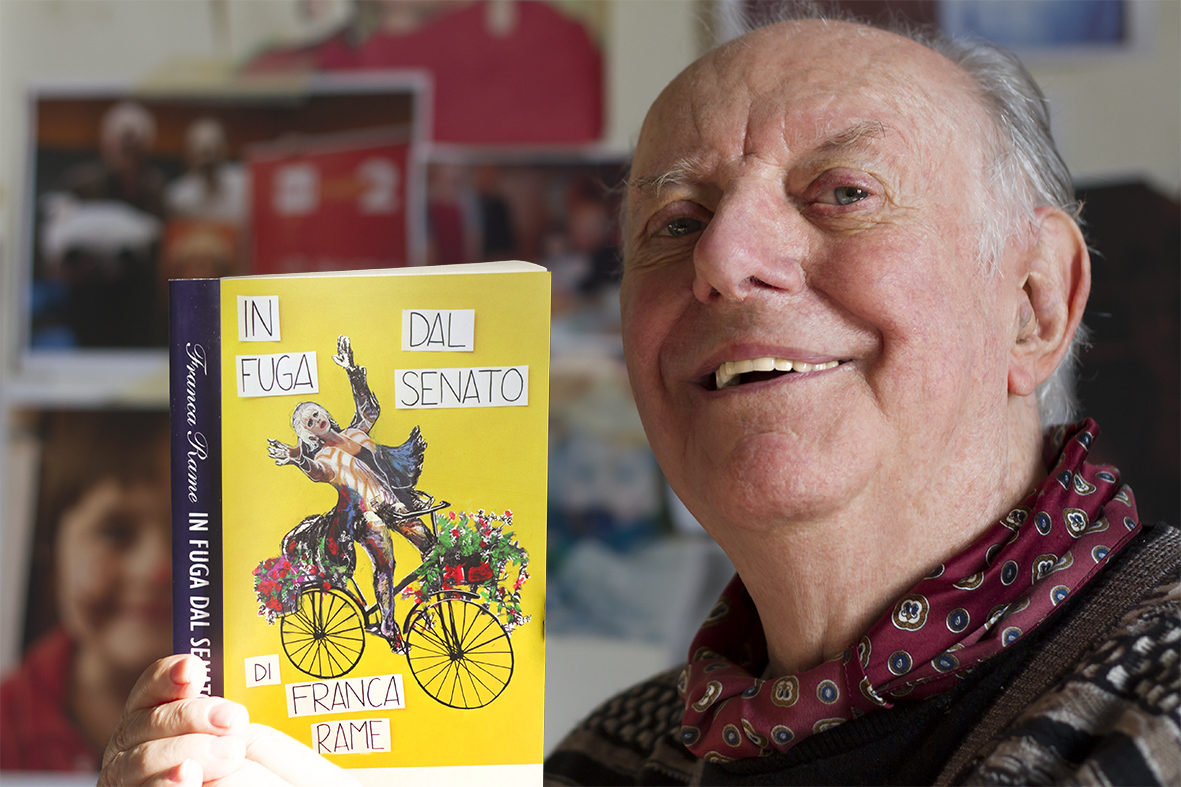 Dario Fo al Teatro Sistina con la testimonianza civile e politica di Franca Rame, tratta dal libro ultimato negli ultimi giorni di vita dell’attrice. (foto di Luca Vittorio Toffolon)Dario Fo torna a teatro con una presentazione-spettacolo dedicata al libro In fuga dal Senato (Chiarelettere, Milano 2013) il prezioso lascito in cui Franca Rame ripercorre l’amara esperienza vissuta in Parlamento tra il 2006 e il 2008, un viaggio della durata di 19 mesi nel luogo che l’attrice definisce “il frigorifero dei sentimenti”, narrato senza mediazioni e con la sensibilità teatrale e comica di chi è stata da sempre sulla scena; un racconto drammatico e al contempo grottesco legato a doppio filo all’impegno civile e politico durato per decenni e mai terminato, nemmeno dopo le sofferte dimissioni.