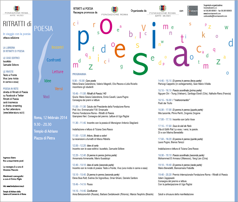 La rassegna sarà inaugurata dal Presidente della Fondazione Roma, Prof. Avv. Emmanuele Francesco Maria Emanuele, ideatore dell’iniziativa, che dichiara: «E’ con grande piacere che do l’avvio a questa edizione di ‘Ritratti di Poesia’, che apre il calendario annuale delle iniziative culturali realizzate dalla nostra istituzione. Il consolidarsi di questa rilevante iniziativa, giunta alla sua VIII edizione, rende concreto, l’impegno che la Fondazione Roma svolge a favore della riscoperta del patrimonio culturale italiano, dando voce ad una forma letteraria poco divulgata, ma che rappresenta una delle eccellenze che hanno reso in passato, come oggi, lustro alla letteratura del nostro paese. La realizzazione ed il successo di questa manifestazione – prosegue il Presidente – rappresenta un’ulteriore testimonianza del mio convincimento secondo cui il ruolo del privati, soprattutto se non profit, possa e debba rappresentare una risorsa ineludibile per un nuovo modello di gestione nel settore della Cultura. La poesia è la parola dell’anima, è un mezzo immediato per esprimere il nostro io, è espressione di un arte delicata ma al contempo concreta che, soprattutto in questo periodo storico così spersonalizzante, permette di rendere reale il sentimento dell’uomo nascosto nell’uomo. È quindi proprio per il valore che risiede in questa nobile forma d’arte che essa sia parte integrante dell’attività che la Fondazione Roma, attraverso la Fondazione Roma-Arte-Musei, svolge nel settore dell’arte e della cultura e che si sviluppa anche attraverso la musica, il teatro e le arti visive, con le esposizioni organizzate presso gli spazi del Museo Fondazione Roma nelle sedi di Palazzo Sciarra e Palazzo Cipolla».