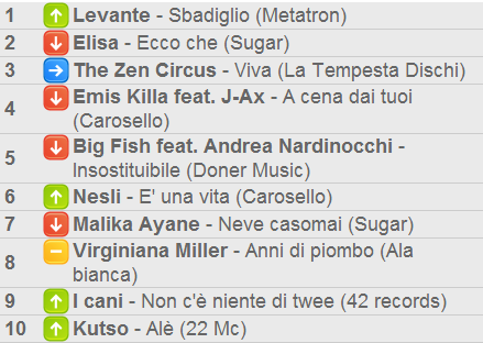 LEVANTE ANCORA IN TESTA ALLA INDIE MUSIC LIKE CON ELISA E GLI ZEN CIRCUS CHE IRROMPONO SUL PODIO. L’HIP-HOP IN TOP TEN HA LE LIRICHE DI EMIS KILLA CON J-AX, DI NESLI E DI BIG FISH & NARDINOCCHI. ARRIVANO I KUTSO E SI CONFERMANO MALIKA AYANE, VIRGINIANA MILLER E I CANI.