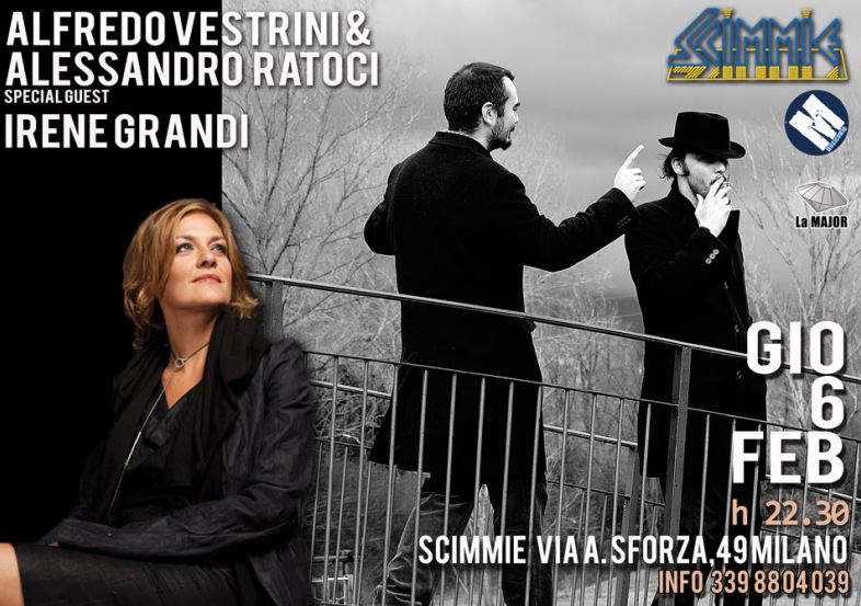 Giovedì 6 febbraio, lo storico locale SCIMMIE (Via Ascanio Sforza, 49, Milano) ospita il poeta Alfredo Vestrini e il compositore Alessandro Ratoci (pianoforte) in concerto per presentare il nuovo album “Conversatorio”. Con loro si esibirà come special guest Irene Grandi che presterà la propria voce alle canzoni di Alfredo & Alessandro.