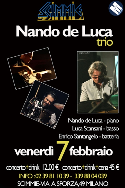 Venerdì 7 febbraio sarà la volta di NANDO DE LUCA TRIO. Il gruppo è composto dal celebre musicista e arrangiatore Nando de Luca al pianoforte, Luca Scansani al basso e Enrico Santangelo alla batteria. Il trio porta sul palco composizioni originali e un repertorio di standards americani, brani da Music-Hall dei grandi compositori come Gershwin, Porter, Waller, Berlin, Ellington.
