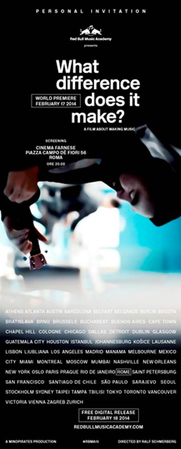 RED BULL MUSIC ACADEMY presenta in anteprima il lungometraggio “WHAT DIFFERENCE DOES IT MAKE? A FILM ABOUT MAKING MUSIC” . Sarà disponibile in digitale  dal giorno  18 febbraio sul sito www.rbma15.comVIVERLAMUSICAVIVERLAMUSICA