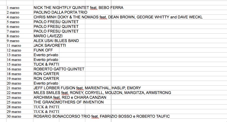 Ecco tutti i protagonisti del mese di marzo: l’affermato Nick the Nightfly, che presenterà in esclusiva il suo nuovo progetto discografico, “Be yourSelf”, in una serata speciale con il chitarrista Bebo Ferra (1 marzo); il trio capitanato dal contrabbassista Paolino Dalla Porta (2 marzo); l’originale bassista danese-vietnamita Chris Minh Doky in una formazione eccezionale, affiancato anche dal più grande batterista jazz – fusion Dave Weckl (4 marzo); il quintetto più longevo della scena jazz italiana, Paolo Fresu Quintet (dal 5 al 7 marzo); un viaggio in musica del grande e leggendario paroliere Mario Lavezzi (8 marzo); l’originale sound blues della Alex Usai Blues Band (9 marzo); il giovane e promettente Jack Savoretti, che presenta con la sua voce ruvida e struggente l’ultimo album “Before the storm” (11 marzo); la prima funky marchin’ band italiana, i Funk Off (12 marzo); lo storico duo di Tuck & Patti, entrato nella storia della musica (15, 28 e 29 marzo); il Roberto Gatto Quintet con un tributo a Miles Davis (16 marzo); l’apprezzato contrabbassista Ron Carter (18 e 19 marzo); il pluripremiato tastierista fusion Jeff Lorber, insieme ad altri mostri sacri della scena musicale come il sassofonista di Chick Corea Eric Marienthal, lo storico bassista Jimmy Haslip e il poliedrico batterista Sonny Emory (21 marzo);il cast stellare di Miles Smiles, super band formata da alunni delle formazioni di Miles (22 marzo); il quartetto Archimia, in una speciale serata con Red e Chiara Canzian (23 marzo); un grande tributo a Frank Zappa con i Grandmothers of Invention ed, infine, le suggestive melodie di Rosario Bonaccorso con Fabrizio Bosso e Roberto Taufic (30 marzo).