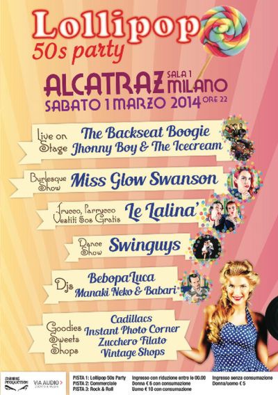 Sabato, 1 marzo, sarà la volta della serata Welcome to the jungle con Lollipop, un party anni 50 travolgente che sbarca nel noto locale milanese con Backseat Boogie & Johnny Boy and The Icecream. La serata prevede: doppio dj set, spettacolo di burlesque, spettacolo di ballo rockabily, vestiti 50s gratuiti, trucco e parrucco, zucchero filato, Cadillacs, set fotografico e mercatino vintage. Dalle ore 24.30 BePopaLuca e Manaki Neko Babari. Nella sala 2 sarà protagonista la musica commerciale e l’happy music con Doctor M, mentre nella sala 3 si ballerà a ritmo di R’n’R con il Cathouse Rock’n’Roll Party.