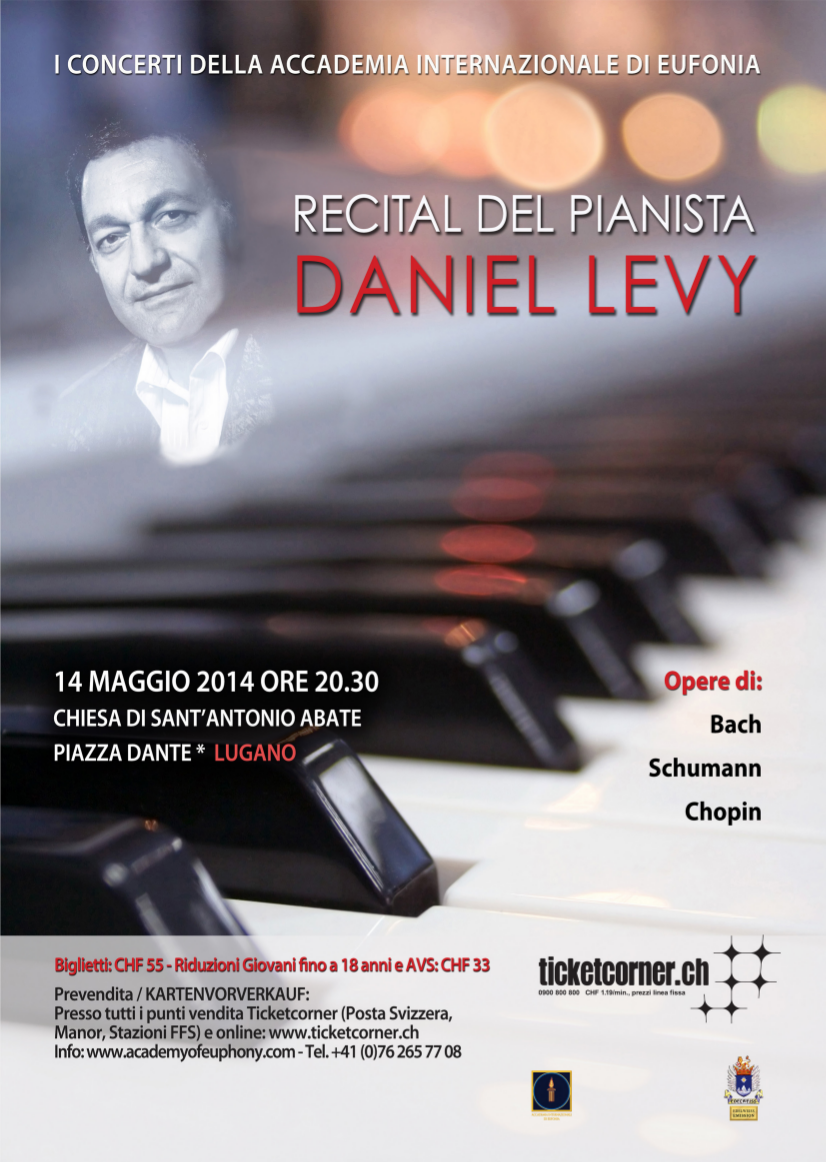 L’Accademia Internazionale di Eufonia presenta un recital del Maestro DANIEL LEVY che avrà luogo nella Chiesa di Sant’Antonio Abate a Lugano, mercoledì 14 maggio, alle ore 20.30. Dopo i concerti nell’ambito dell’Ascona Music Festival, la presenza primaverile in Ticino di Levy terminerà con questo intimo recital che egli dedica a Bach, Schumann e Chopin.