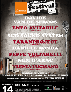 (@alcatrazMilano) (@terronfabiosss) (@nididarac) (@EnzoAvitabile) (@SoleterreOnlus) (@DavideVDS) (@DRondaCommunity) (@peppevoltarelli) #taranproject (@YleniaLucisano) Domenica 14 dicembre si terrà all’Alcatraz di Milano la seconda edizione del SOLETERRE FESTIVAL (l’anno scorso furono protagonisti, tra gli altri, gli Afterhours con il loro spettacolo “Hai paura del buio?”), un evento unico che ospiterà grandi esponenti del panorama folk italiano con l’obiettivo di… Read More (@AlcatrazMilano) VAN DE SFROOS, AVITABILE, VOLTARELLI,TARANPROJECT,RONDA,NIDI D’ARAC,SUD SOUND SYSTEM e LUCISANO il 14 Dicembre per SOLETERRE FESTIVAL